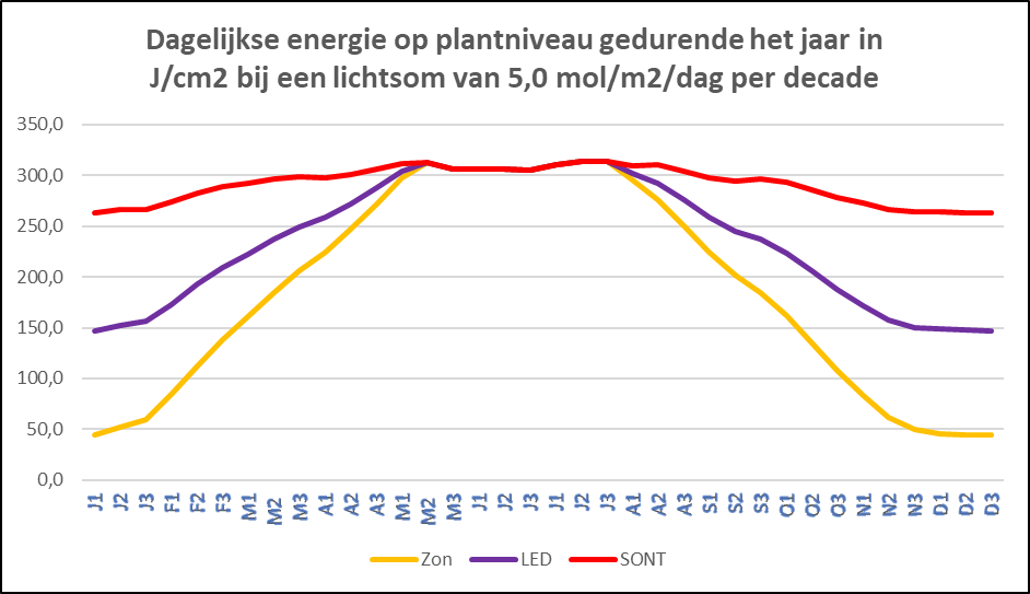Grafiek: De dagelijkse energie op plantniveau door het jaar heen: op de X-as is elk punt een decade (een 10-daags gemiddelde). De maanden zijn opgesplitst in 3 delen. De lijnen van LED en SON-T zijn de opgetelde waarden van de belichting plus zon (de gele lijn).