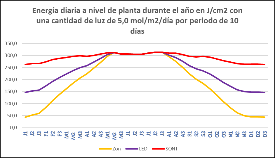 En el eje X, cada punto corresponde a una media de 10 días. La meses están divididos en 3 partes. Las líneas de LED y SON-T son la suma de los valores de iluminación + sol (la línea amarilla).